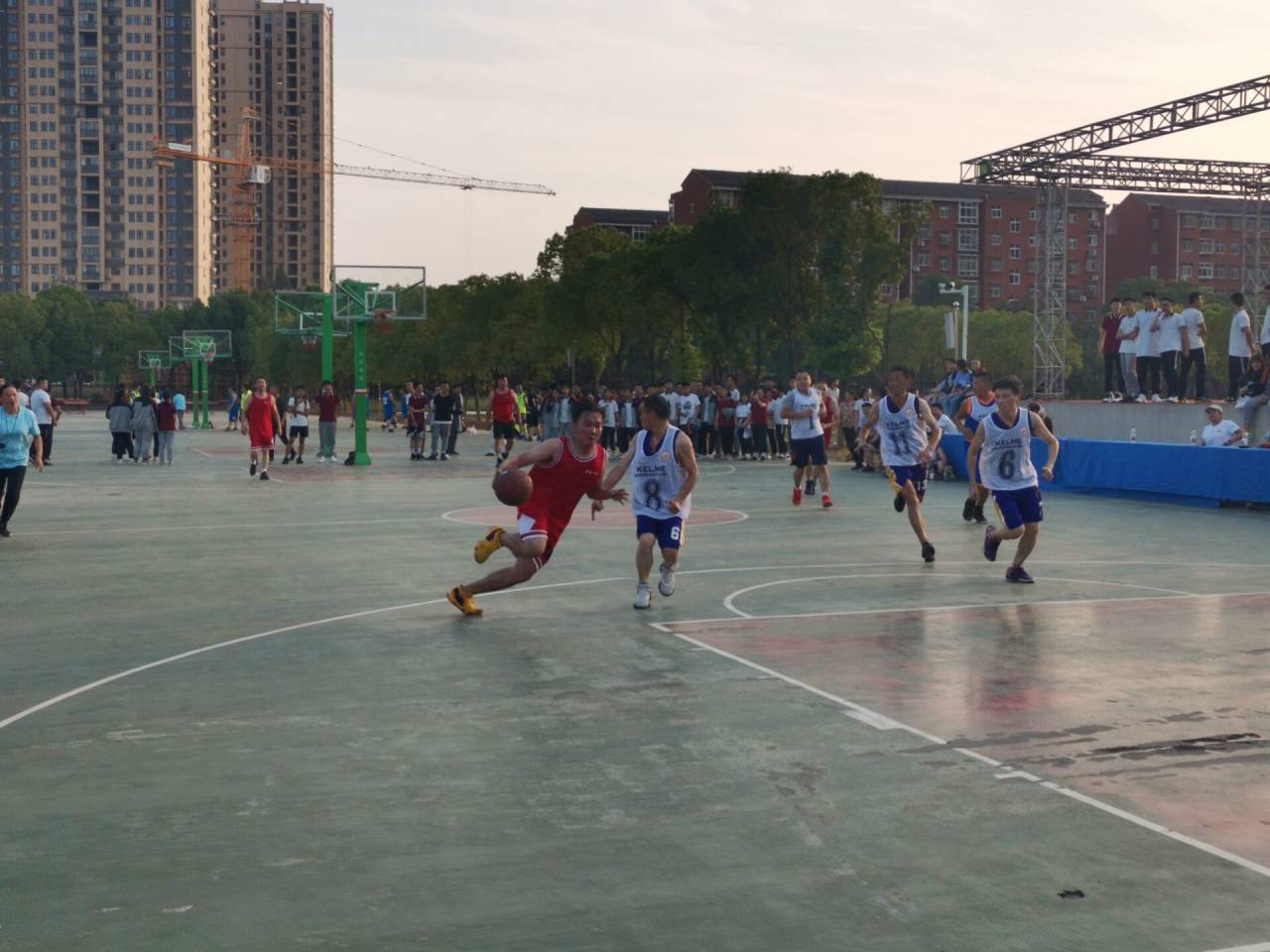 参加比赛的四支球队(高一教职工男子篮球队、高二教职工男子篮球队、高三教职工男子篮球队、启澴寄宿学校教职工男子篮球队)分别捉对厮杀,其中高一对阵启澴、高二对阵高三,每支球队都派出了最强阵容。各年级主任、级部主任带领教师、学生啦啦队助阵,特别是高三年级负责人杨顺云手提喇叭,带领高三四个上体育课的学生组成阵容强大的啦啦队,将比赛的激烈气氛不断地推向高潮。队员们在球场上拼劲十足,不怕苦、不怕累,有的带伤坚持比赛,还有方火生、李开启等老教师老教师老当益壮,同年轻人同台竞技,引起观众的阵阵喝彩。经过激烈角逐,高三年级29比26险胜高二年级。启环寄宿举全校之力,险胜高一年级。大家赛出了水平和风度。