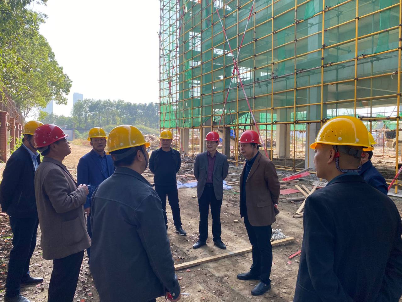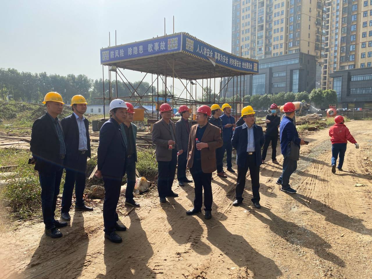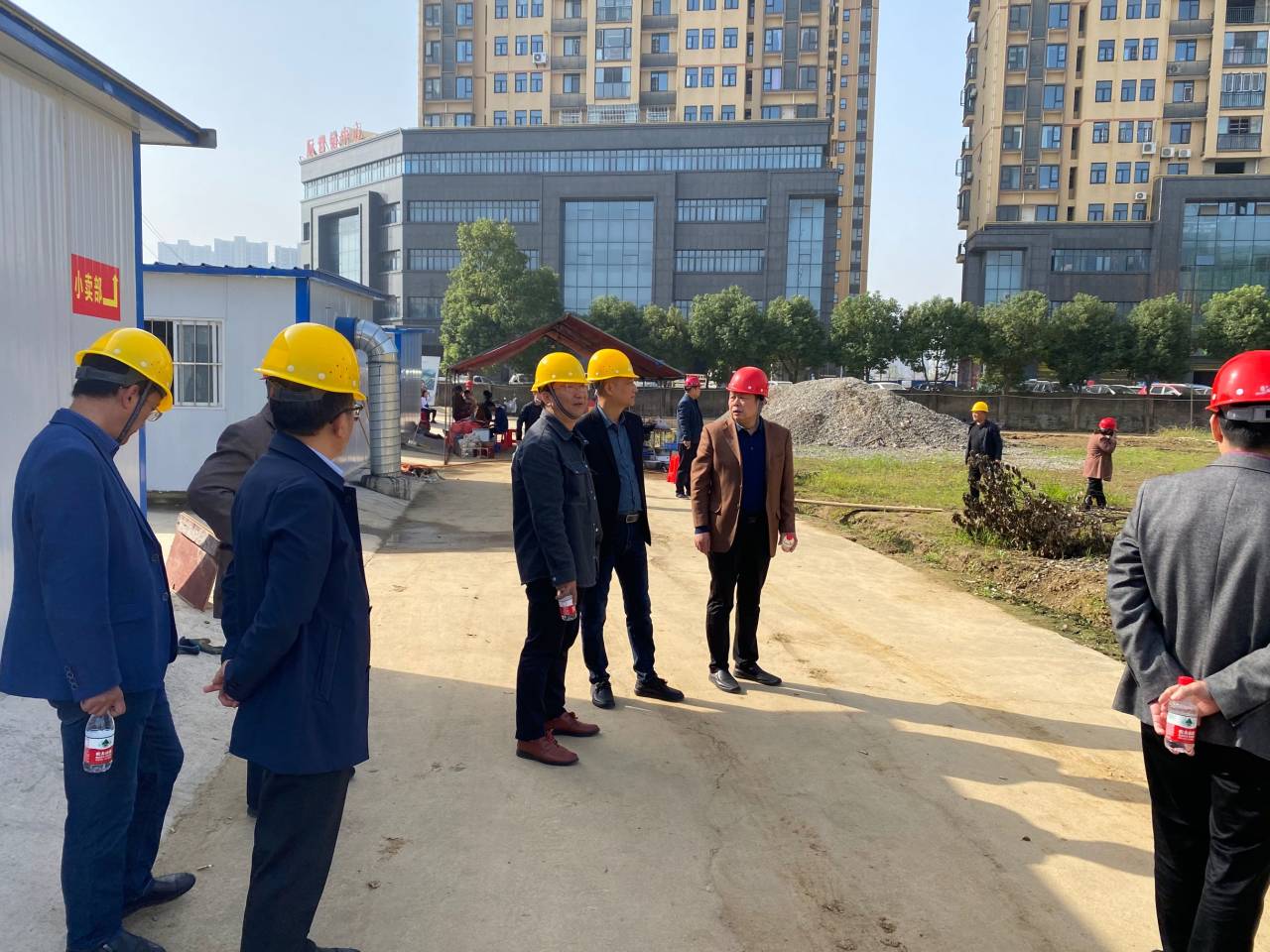10月22日中午,启澴寄宿学校建设工地,教学楼主体工程已基本完成,正在喜封金顶。我校校委会领导陪同区教育局领导视察启澴寄宿学校施工情况,领导们向施工单位负责人详细了解了工程建设进度与工程质量。