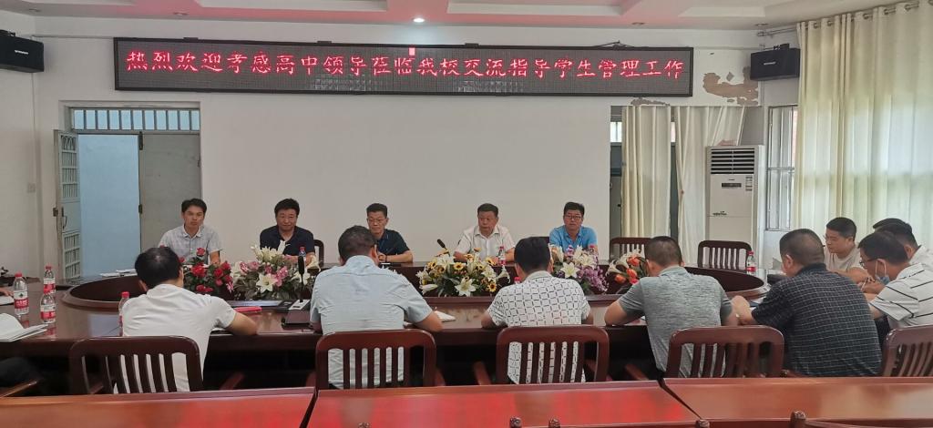 9月7日上午,孝感高中副校长万国平受校长程文辉的委托带领学校总务、教学、政教、年级干部一行12人来我校学习封闭式管理经验。校长梅建辉、党委书记付世俊、副校长辛百魁、叶显斌等领导在学校2号会议室热情接待了来宾,双方积极开展了经验交流活动。