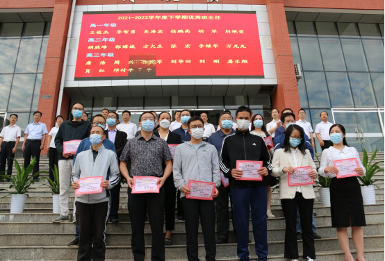 庄严的升旗仪式后校长梅建辉、党委书记付世俊为上学期20位优秀班主任颁奖;副校长张胜华、辛百魁、叶显斌、祝亮分别对210班、118班等12个优秀班集体发放锦旗。