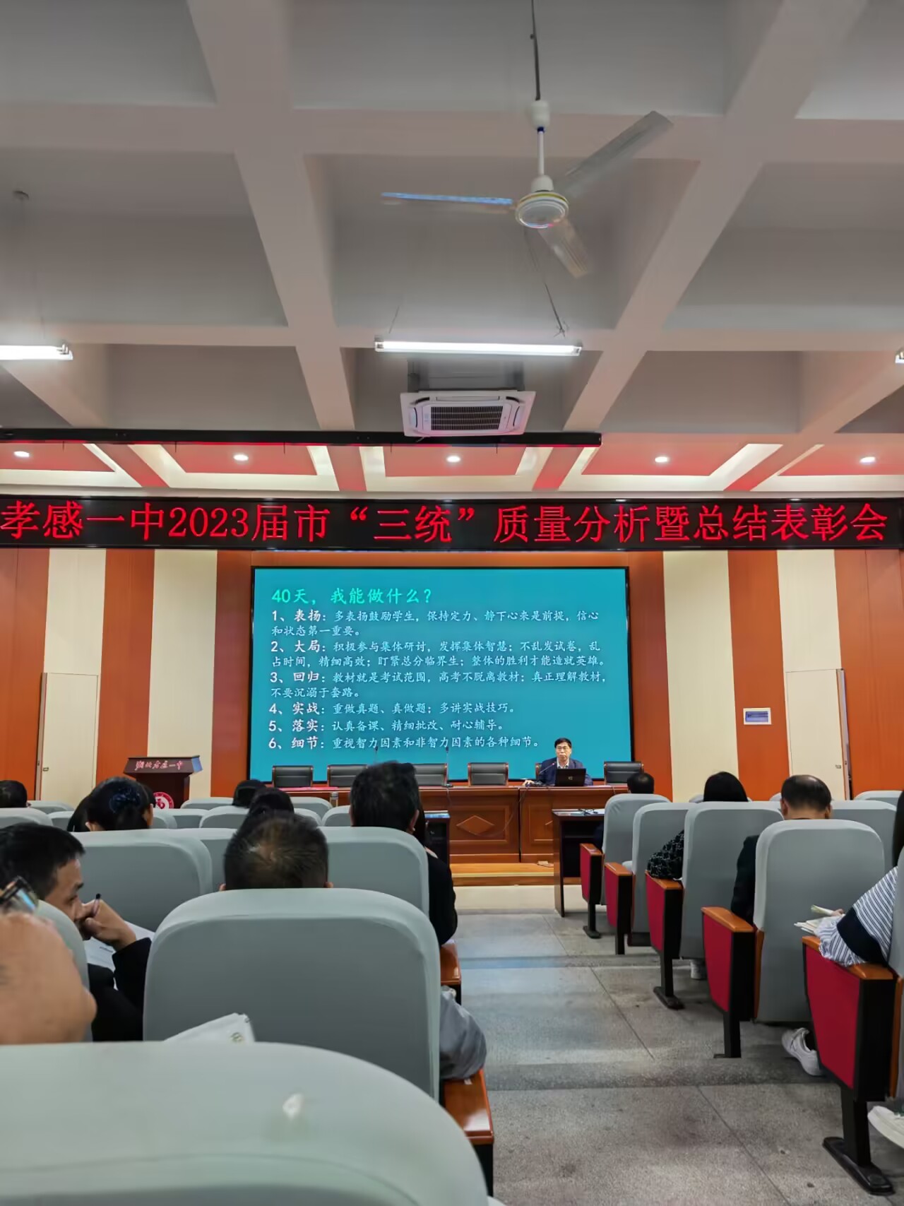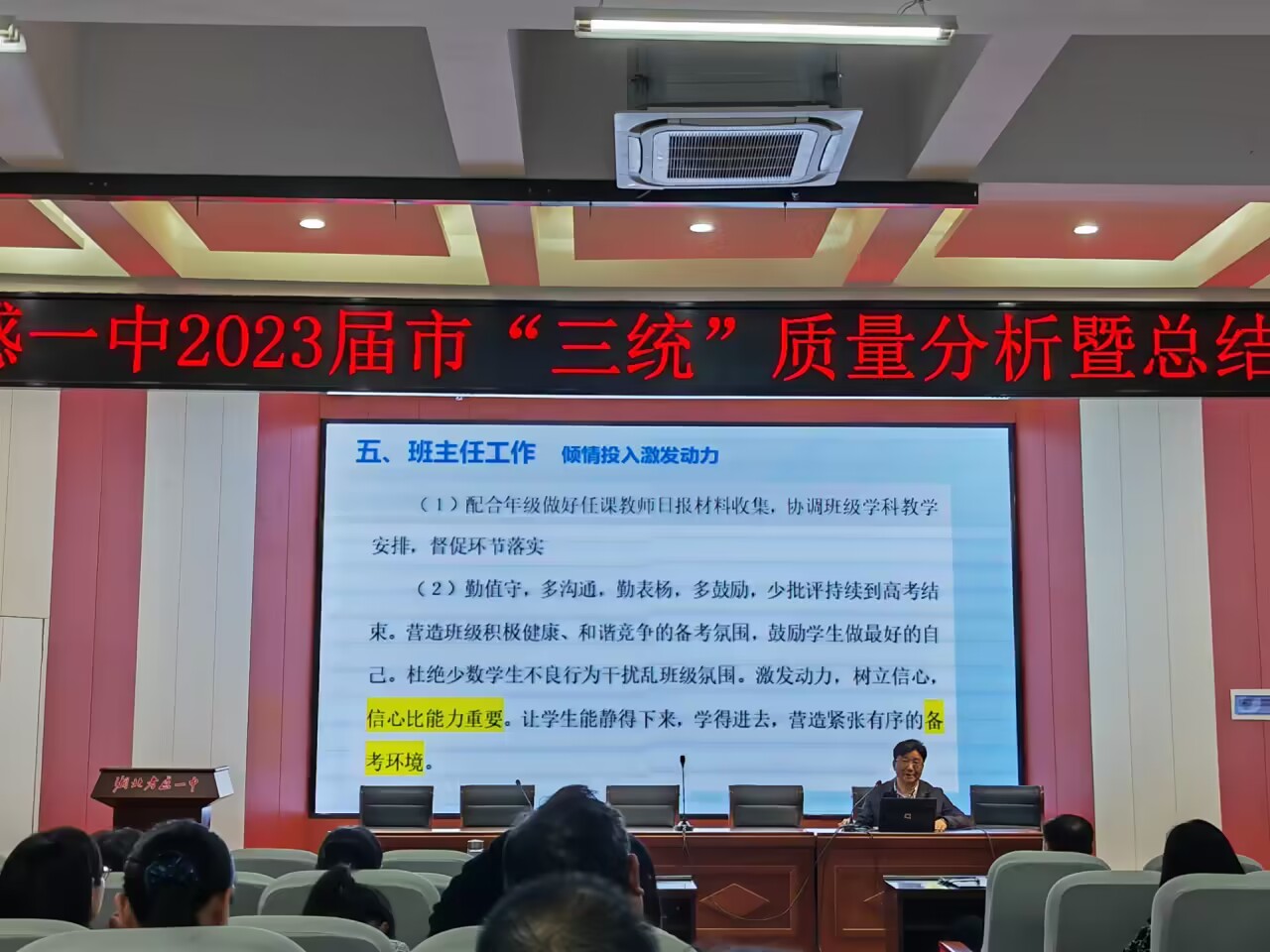 4月27日晚,高三年级全体教师在学术报告厅举行“市三统”质量分析会。校长梅建辉、分管教学副校长辛百魁参加了会议。