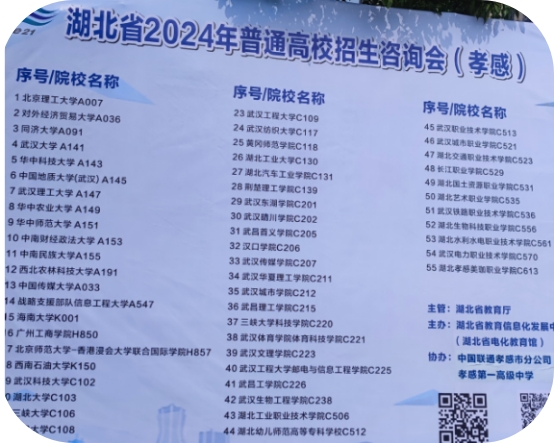 6月26至27日,由湖北省教育厅电教馆、育路通、升学在线等组织的2024湖北省普通高招现场咨询会在孝感一中风雨棚举行。咨询会现场考生不仅了解到省内外知名高校的预估分数线,还有高校招生老师现场答疑解感,活动现场气氛热烈。