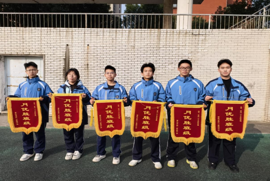 12 月 2 日课间时分,孝感一中高二年级在足球场主席台前举行简短而庄重的11 月日常规总分优胜班级流动红旗颁发仪式。鲜红的流动红旗在获奖班级代表手中迎风飘扬,不仅是对班级日常管理工作的肯定,更激发了全体高二学子争先创优的积极性,为校园营造了浓厚的班级竞争与合作氛围。