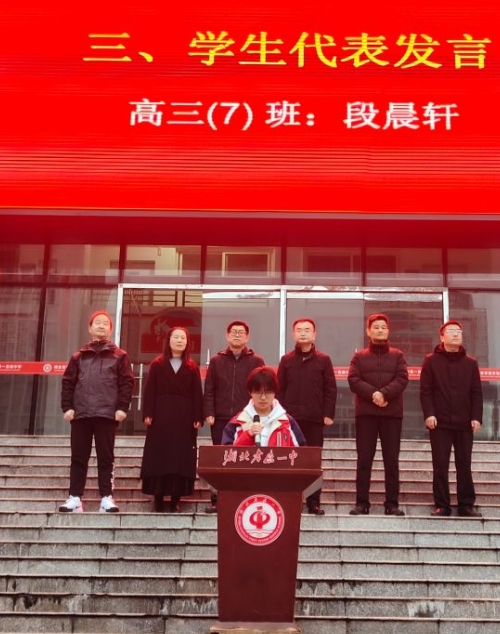 作为即将奔赴高考战场的主力军,高三七班段晨轩同学作为高三学生代表发表了动人心弦的感言。他分享了三个关键词:一是“坚守”,呼吁各年级同学珍视当下、专注沉淀;二是“拼搏”,强调奋斗是贯穿高中三年的主旋律;三是“同行”,感恩同学互助与师长护航,并祝愿全校师生在新征程上携手共进、再创辉煌。他激情澎湃的发言,引发了现场师生的强烈共鸣,也点燃了学弟学妹们拼搏进取的热情。