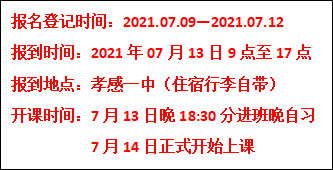高一上学期时间紧,活动多,教学任务重,基于此学校决定提前介入我校准高一学生的管理,分线上、线下两种方式实施,线上请关注学校网站信息,线下学校决定中考志愿填报结束后开展为期一个月(7月13日至8月12日)的暑期夏令营活动,夏令营期间孝感一中和启澴寄宿混合编班,原则上有希望被我校录取的准高一学生都要参加,主要内容有:生涯规划教育、初高中衔接教学(约1周左右)、高一新课教学3周左右,活动结束后将举行摸底考试。暑期夏令营期间可以走读,需要住宿的学生学校提供住宿,寝室有空调、热水,需自备行李。