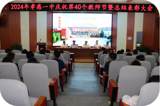 随着第四十个教师节的脚步悄然临近,2024年9月9日上午8:30,孝感一中2024年庆祝第四十个教师节暨总结表彰大会在学校学术报告厅如期召开。学校200余名教职员工齐聚一堂,学校党委书记刘向东,党委副书记、校长夏以祥,党委委员、副校长叶显斌,党委委员、副校长祝亮与会。会议由党委委员、副校长辛百魁主持。此次大会旨在统一思想、明确目标、凝聚力量,为新学期的教育教学工作奠定坚实基础。
