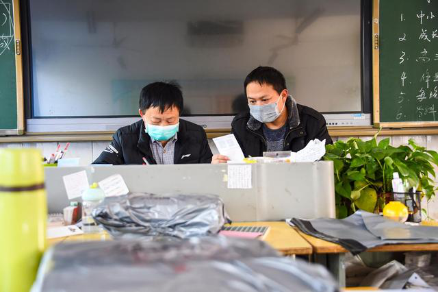 孝感一中的老师在教室核对学生邮寄信息,准备在学习资料包上贴快递信息单(3月10日摄)。受新冠肺炎疫情影响,湖北省孝感市各学校仍处于延期开学状态。为解决学生在家面临缺少必需课本和教辅资料的难题,孝感市教育局联合孝感市邮政分公司、新华书店等为全市中小学生派送学习资料。“助学快递”优先保障高三、初三等毕业班,再依次配送其他年级。记者在孝感一中高三年级组了解到,该校有1000多名高三学生,学校需要逐一核实学生目前所在地的邮寄地址等信息,同时收集学生的学习资料需求并整理成册。目前学校在完成教室消毒的前提下,正组织住校老师和家长等,前往教室整理学习资料。学习资料打包后,交由邮政公司负责免费派送。新华社记者胡虎虎摄影报道