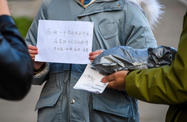 一名孝感一中高三年级学生接收学习资料包后,向工作人员致意,并展示她母亲专门写的感言(3月10日摄)。