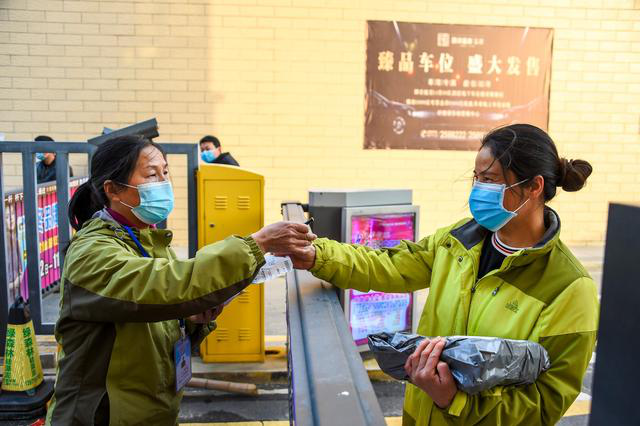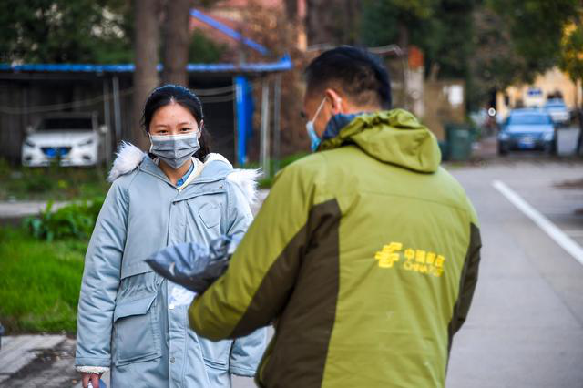 一名孝感一中高三年级学生走向邮递员,准备接收学习资料包(3月10日摄)。