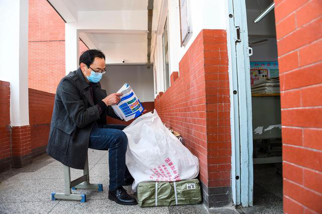 家长沈建群在孝感一中帮忙搬运高三年级学生的学习资料包(3月10日摄)。他说:“特殊时期,为孩子们贡献力量。