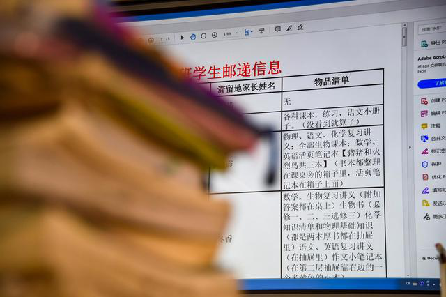 贴快递信息单前,孝感一中的老师逐个核对学生邮寄信息(3月10日摄)。