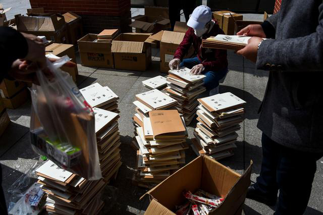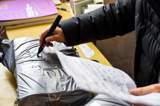孝感一中的老师在学习资料包上贴快递信息单(3月10日摄)。