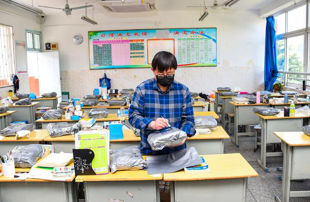 孝感一中老师为高三年级学生打包作业本、笔等文具(3月10日摄)。