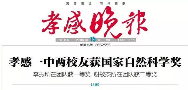 《孝感一中两名同班校友同获2017年度国家自然科学奖》
