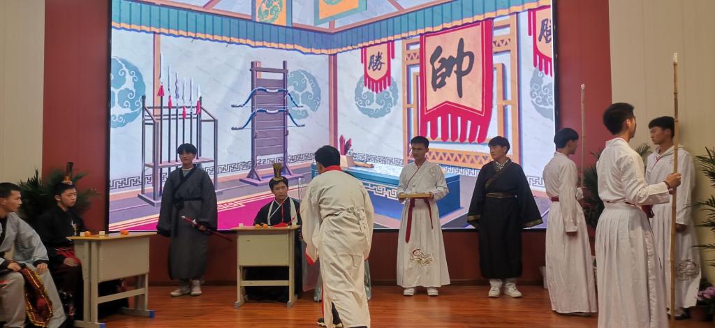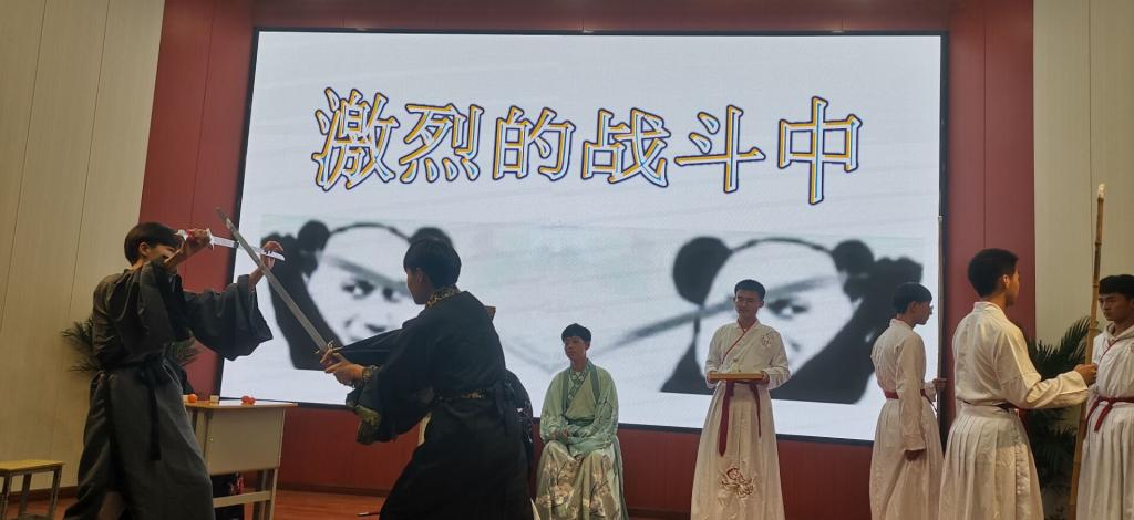 表演过程中,大多数同学们能够放得开,表演起来有模有样,亮点纷呈。《新红船》中的女同学穿上旗袍,端庄稳重;《鸿门宴》中的项羽,霸气十足;项庄舞剑,有招有势;《茶馆》中的王利发、庞太监,腔调惟妙惟肖……