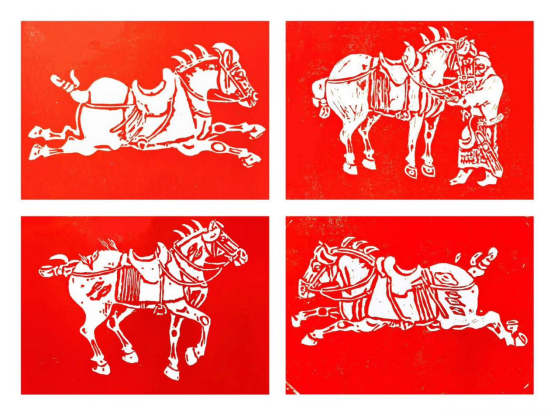 《骏影唐风》组画由我校木刻版画社团聂思汝(205班)、罗繁(213班)、李许一桁(205班)、刘琪班(203班)四位同学联合创作,灵感源自唐代浮雕《昭陵六骏》,作品采用阴刻技法、红色油墨印制。组画包含“绝尘一骑”“秣马整鞍”“霜蹄待发”“逐风千里”四幅画面,红白对比清朗明快,线条简练有力,构图沉稳舒展,精准还原了骏马昂扬矫健的姿态,彰显高中学子昂扬向上的精神追求。