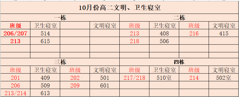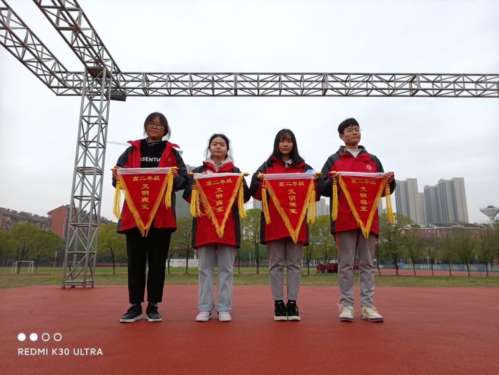 根据高二年级班级量化管理办法,对早操、课间操、眼保健操、教室卫生、宿舍管理、行为规范、学习考勤纪律、班主任考勤、工作落实等方面进行了严格评价,评选出4个10月月考核优秀班级;根据宿舍管理规定,评选出12个文明、卫生寝室。年级叶主任对受表彰的班级、寝室授旗予以表彰。