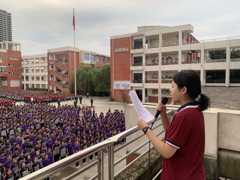 在这里,我特别想对高二高三的大哥哥大姐姐们说。谢谢你们,给我们做出了榜样。你们听讲是那么专注,你们自习是那么安静,你们朗读是那么投入,这一切让我深深震撼。因为一个人在一个时间做一件事并不难,难的是两年三年都能做到这样。你们在去食堂的路上还在欢乐地讨论题目,你们在晚上10:30放学后还在埋头刷题。一定是有一种梦想,有一种力量呼唤着你们,鼓舞着你们去追求,我想,那应该就是一中的灵魂,永不放弃,永争第一,永无止境。现在,请让我代表高一全体学生对你们说,我们一定会向你们学习,你们的优秀,会激励我们更优秀。星星挨在一起最明亮,音符挨在一起最动听,手与手拉在一起最有力量。同学们,让我们携起手来,用汗水铸就梦想,用努力谱写传奇,在环河畔的绿树红墙边,唱响我们最美的青春!