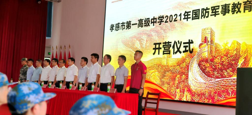 2021年9月24日上午,秋高气爽、阳光灿烂,孝感一中迎来了2021级高一新生国防军事教育实践活动开营仪式。本次开营仪式在孝南区学生综合实践基地培根楼隆重举行!孝南区学生综合实践基地校长刘聪、孝感一中校长梅建辉、党委书记付世俊、副校长张胜华、副校长叶显斌、副校长祝亮、校长助理李平、学生发展中心主任章雄林,高一年级主任侯著宏、钟华志、王力,2021级全体新生、班主任及参训官兵参加了本次开营仪式。