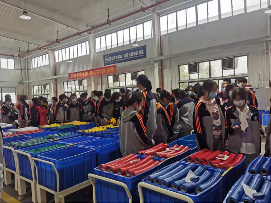 十几分钟后抵达舒氏集团,梅校长为代表的学校领导陪同学生,由集团专人带领进行有序参观。首先参观的是产品的生产车间,包括半成品车间、成品车间、涂布车间等等,集团负责人边走边介绍各个车间的主要内容和特色,使学生了解到产品的基本生产流程和企业的运作方式,丰富拓展学生的知识视野。学生不仅要认真学习课本知识,也要了解课本之外生活实践中的知识,这对于学生未来的全面发展实有助益。