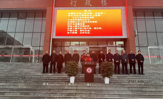 仪式第四项由高三(1)班叶帆同学代表发言,他代表全体高三同学为学弟、学妹们树立榜样,表现了饱满的备考精神状态和高考必胜的决心。紧接着,由高三(16)班詹壮同学带领全体高三同学宣誓,同学们的誓言响彻全场,将仪式推向高潮,既点燃高三同学备考的激情,也激发高一、高二同学学习的斗志。