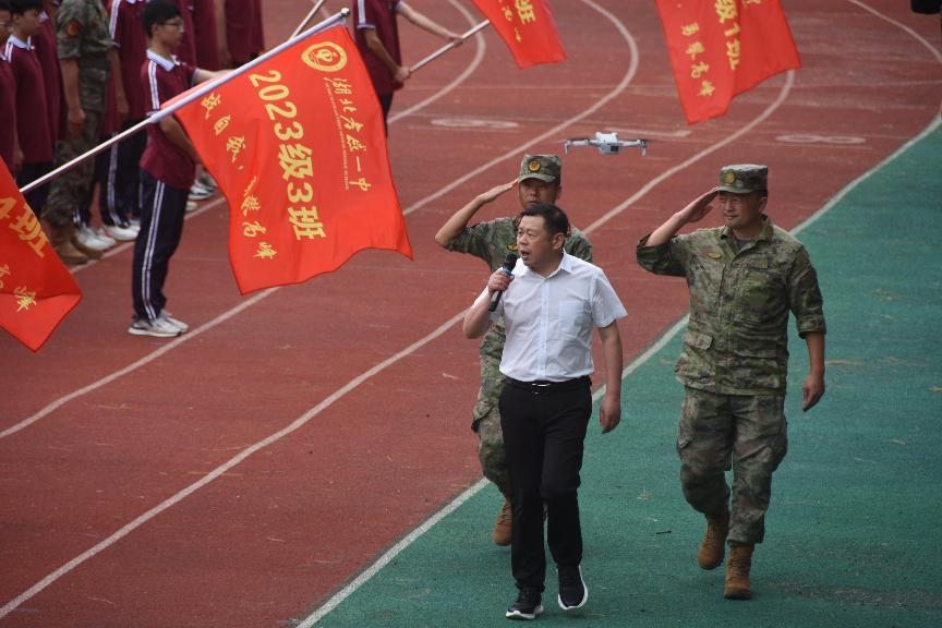 在庄严的国歌声中,全体人员肃穆站立,注视五星红旗冉冉升起。2023级新生们气势如虹,以最佳的精神面貌接受检阅。李涛部长和梅建辉校长在总教官的陪同下,走过一支支队伍,亲切地慰问:“同学们辛苦了!”尽显温情与关怀;新生们则以响遏行云的声音回应:“为校争光!”