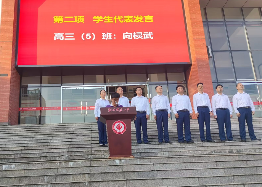 毕业生代表高三(5)班向棂武同学登台发言。他深情回望三年奋斗时光,感恩师长教诲与同窗相伴,更以“志存高远,脚踏实地”与全体毕业生共勉,铿锵话语中尽显新时代青年的责任担当,同时带领全体高三学生庄严宣誓,引发全场强烈共鸣。