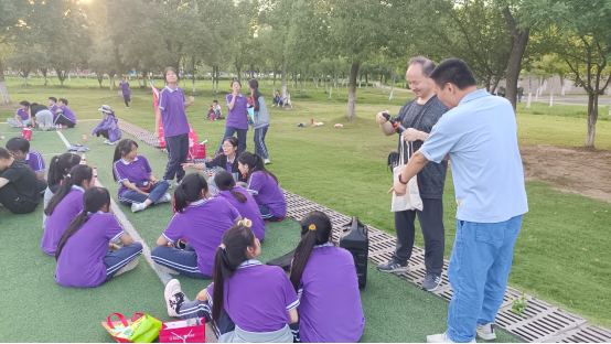 活动过程中,校长夏以祥也来到活动现场看望大家,学生们异常兴奋地跟夏校长打招呼,绿草上一片欢腾。不少家长志愿者也参与其中,用镜头记录下了孩子们的笑脸。