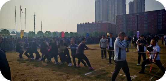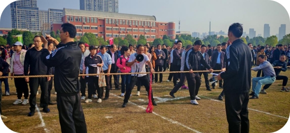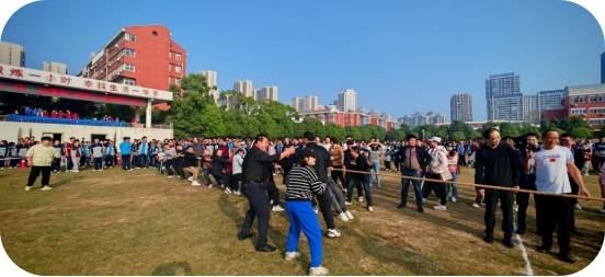 随着裁判的一声哨响,拔河比赛瞬间点燃了全场师生的热情。参赛队伍由来自孝感一中与启澴高中各年级教师代表组成,他们精神抖擞地站在绳索两端,准备迎接这场力量与策略的较量。在观众的加油声中,每一位选手都凝神屏气,身体后倾,双手牢牢地握住绳索,双脚紧紧扎向地面,仿佛一条条势不可挡的苍龙。
