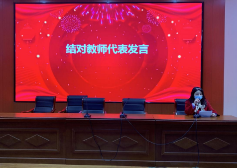 仪式第三项,优秀学员汤黎老师代表结对教师发言。汤老师的发言,表达了对学校和师父的感激,我们也听到了她对尽快成长的渴望和对做好本职工作的决心。