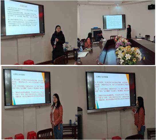范庆芳老师目前是高三5、6班的英语教师,黄冉丽老师目前是高三9、10班生物教师。她们首先都介绍了班级基本情况,包括组合类型,目标人数;其次,重点对学生特别是临界生进行了详细分析,精确到了具体的每一个人;接着对自己所带的班的试卷情况做了横向和纵向的比较分析,总结优点,更归纳不足;最后针对考试的情况进行了反思并拿出可行性措施。黄冉丽老师还根据这次的考试情况设想了二轮复习备考策略。