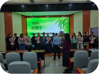 典礼在悠扬的音乐声中拉开序幕,首先进行的是指导教师向青年结业教师赠送成长手册的环节。一本本精心准备的手册,记录了每位青年教师在结对帮扶过程中的成长足迹,也承载了指导教师们对他们的殷切期望和美好祝福。青年教师们接过手册,脸上洋溢着感激与自豪的笑容。紧接着,青年教师们以一束束鲜花回敬给他们的指导教师,以此表达对他们无私指导与辛勤付出的深深感恩之情。鲜花与笑脸交相辉映,现场气氛温馨而感人。随后,结对的教师们自由合影留念,记录下这一难忘的时刻,每一张合影都定格了师徒间深厚的情谊和共同的记忆。