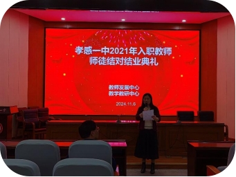 2024年11月6日,2021年入职师徒结对教师结业典礼在孝感一中学术报告厅隆重举行。此次典礼旨在总结过去一段时间内师徒结对项目的成果,表彰在结对过程中表现突出的指导教师和青年教师。此次典礼不仅是对过去一段时间师徒结对成果的总结,更是对未来教育事业的展望与传承。