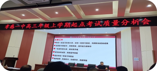 级部主任潘俊军作了详细的数据分析报告。与孝感市其他一中相比,本次考试孝感一中高三年级在总分平均分、总分一本率方面的排名均居第二位,各学科一本上线率虽各不相同,但整体都呈现出良好的上升态势。在工作安排建议中,潘主任特别指出当前临界生培补应当注重的问题,即补信心,补态度,补知识,通过促进临界生成绩的提高提升年级竞争力。