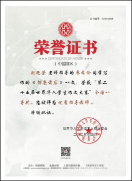 世界华人学生作文大赛始创于2000年,是由中国侨联、全国台联、人民日报海外版、《快乐作文》杂志共同主办的世界性华人写作比赛。世界华人学生作文大赛是得到教育部认证的全国性白名单赛事。本届大赛共吸引了来自50个国家和地区的430多万华人华侨学生参赛,累计收到复审稿件42万余份,被誉为华语写作界的“奥林匹克”。大赛根据国内、海外不同地域特色,分别设置写作主题:国内聚焦“汉字之美”“友谊怎样‘翻译’”“和谐”“中华文明”;海外围绕“汉字之美”“友谊怎样‘翻译’”“故乡”展开,旨在搭建全球华人学生文化交流桥梁,激发创作活力,弘扬中华优秀传统文化。