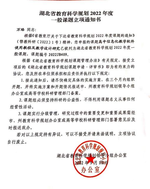 经专家组评审,湖北省教育科学规划领导小组2022年度研究课题立项评审结果已揭晓,全省批准立项的课题共700个。其中,我校万珞老师主持申报的课题《高中信息化教学软件使用教程及教学设计研究》被列为湖北省教育科学规划2022年度一般课题,是孝南区两个省级课题中的一个。