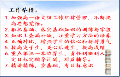 教学与教研中心要求各学科规范质量分析内容及流程,考试质量分析包括各班答题得分比较分析、试卷每题答题统计及分析、前段时间备课组工作得小结、后阶段备课组的工作举措。要求各备课组质量分析必须做成PPT课件,并利用集体备课时间统一进行质量分析。