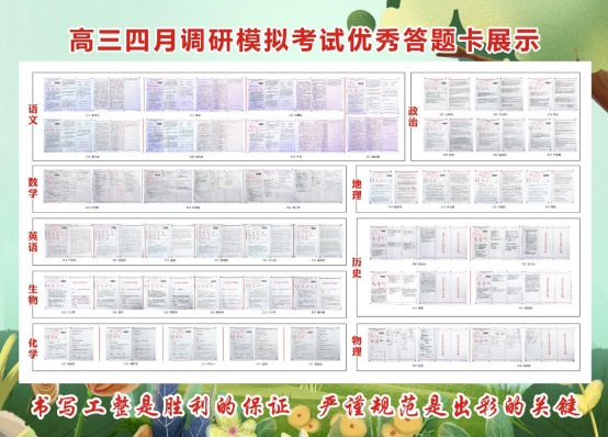 为进一步培养学生良好的书写习惯,切实提高学生答题的规范性,高三4月联考后,高三年级组织开展了“优秀答题卡”展示活动。