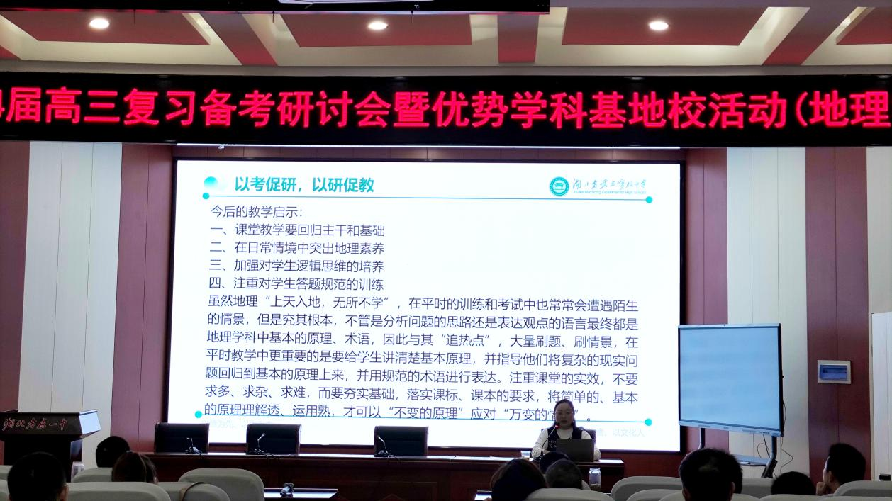 紧接着高三地理组长徐行超就我校高三地理备课研课做了《高三地理备考策略和经验交流》报告研讨会,深入浅出地展示了我校地理老师日常课堂课下的方方面面,早自习的规范任务布置,学生培补,周测考试等展示了平时夯实的教学细节,得到了其他学校老师的一致认同与表扬。