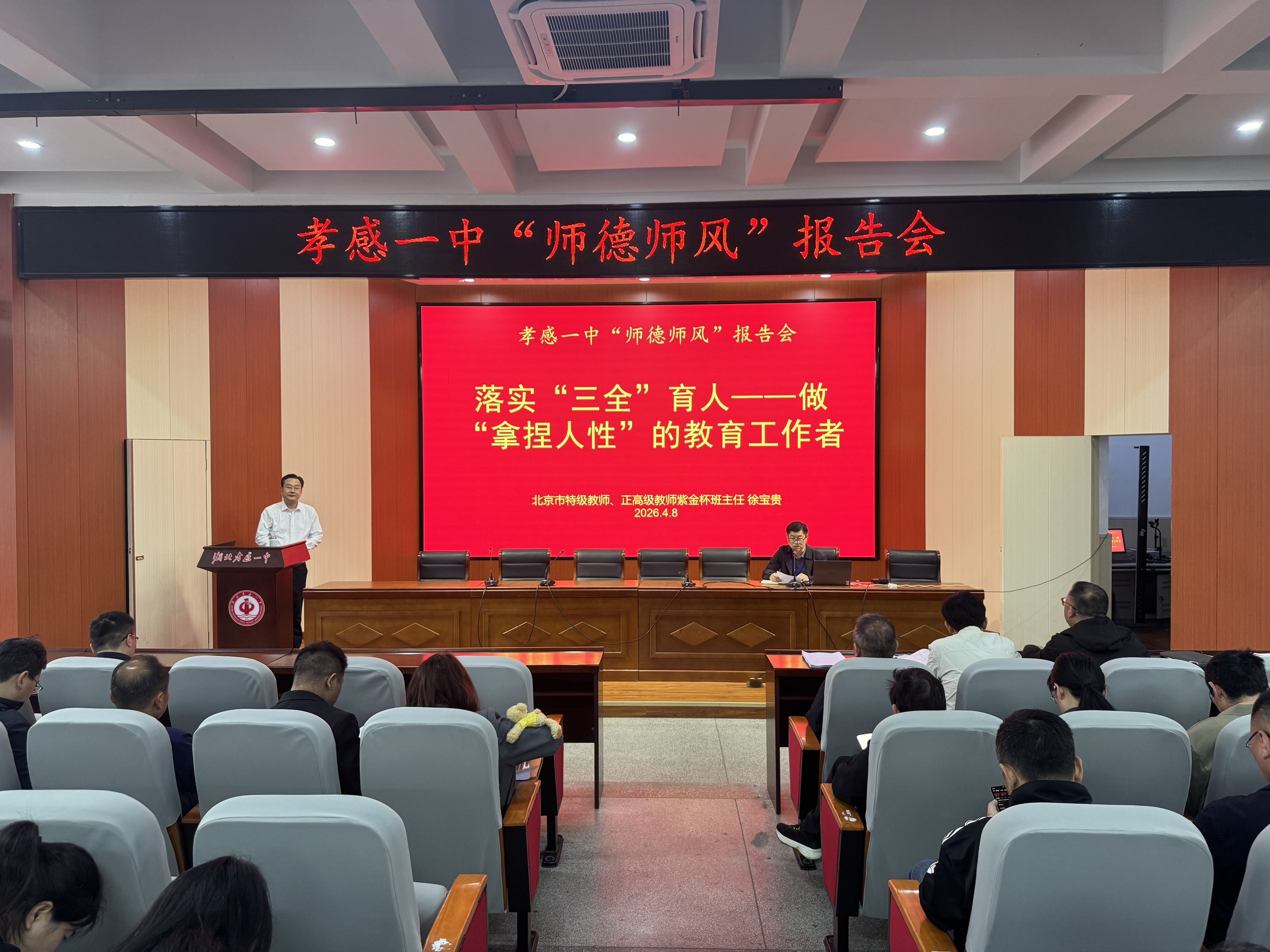 4月8日上午,学校特邀北京市及山东省双特级教师、享受国务院特殊津贴专家徐宝贵教授,作了一场以“落实‘三全’育人”为主题的师德师风报告会。