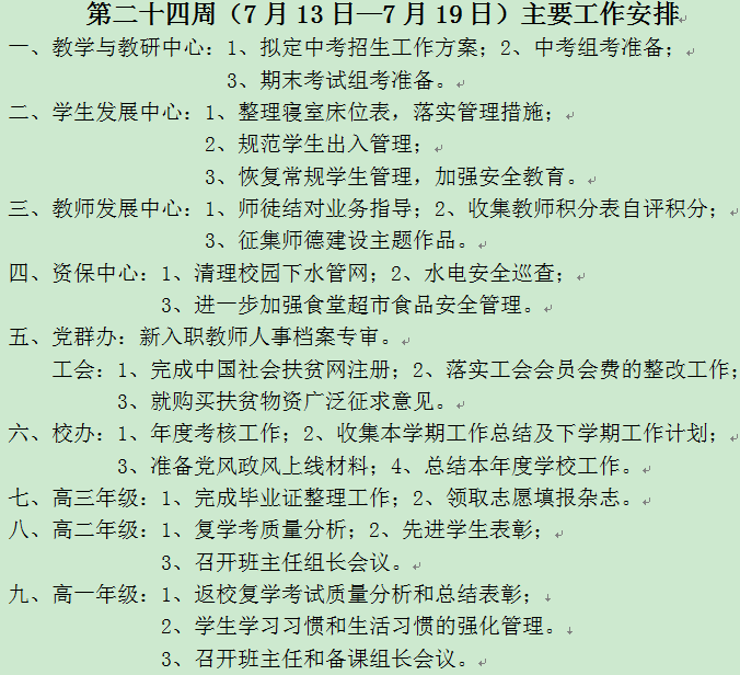 第二十四周(7月13日—7月19日)主要工作安排