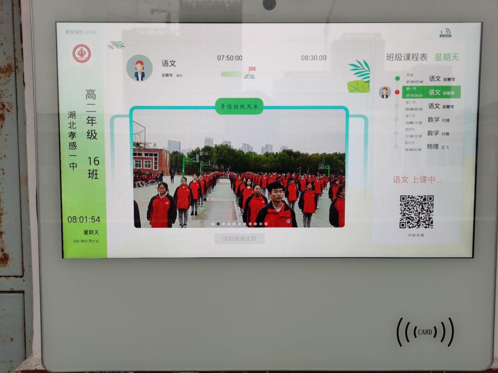 “智慧班牌”是一块可触摸操控的显示屏,涵盖了多媒体信息发布、综合素质评价、考勤管理、家校互通、教务管理、成绩分析等多种功能,不仅实现了学校管理的高效化、智能化,还有家校联系的功能。