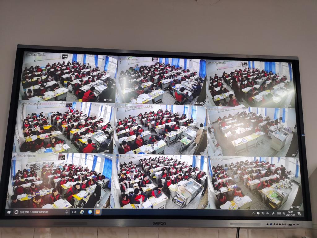 为了进一步加强对课堂的监管,充分了解老师上课情况和学生动态,高二年级向学校申请在年级办公室安装了监控大屏,将每个班级的实时动态视频显示出来,实现远程听课。