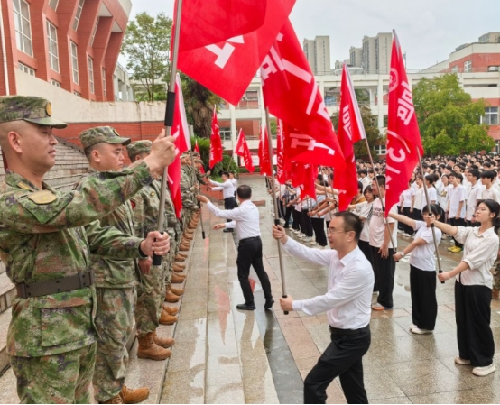 第五项,授旗仪式。校长夏以祥与副校长辛百魁、叶显斌、祝亮等校领导依次将一面面象征着荣誉、责任与使命的“班旗”授予各军训班级。各班教官郑重地接过旗帜,挥舞的连旗瞬间点燃了全场的气氛。这不仅仅是一面旗帜,更是一份沉甸甸的责任与担当,它凝聚着集体的灵魂,预示着为期一周的军训生活正式开启。