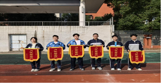 年级负责人钟华志为获奖学生颁发荣誉证书,为优胜班级授予流动红旗。阳光下,获奖学生及班级代表的笑容与飘扬的流动红旗相映,成为校园里一道昂扬的风景线。此次表彰依托课间跑操这一集体活动开展,既节省了教学时间,更强化了全体学生的集体荣誉感与争先意识。