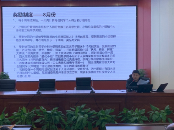 319班杨玉艳老师详细介绍了班级日常管理。从督促学生按时进班到学生逐渐自主提前进班,从学生积极读书到全体大声早晚读,从规范学生教室环境的严肃性到鼓励学生室外环境释放天性,将每一项交由学生管理评价,融洽了师生关系,调动了学生建设班级积极性。216班付腾老师重点介绍了分组自主管理的摸索形成的过程,指出管理需要不断创新,管理规则应易懂易操作,考核评价不仅要持久而且要有吸引力,让学生不产生倦怠感。213班王飞老师全面介绍班级机构设置,分组原则,实施过程,评价方式,班级工作总结等。王老师将学生一切班级活动都以小组为单位开展,包括座位和寝室分配,充分调动集体中所有学生主动性。不仅体现团队合作精神,也鼓励个人争先争优,从而达到共同进步,全面发展的效果。