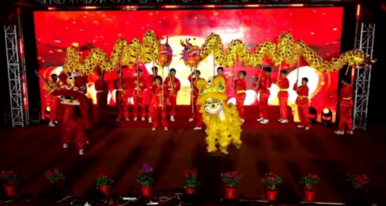 晚会在舞龙舞狮队充满力量与韵律的表演中拉开序幕。在铿锵的鼓点里,舞龙队的队员们步调一致,将长龙舞得活灵活现,龙首引领龙身穿梭起伏,似在云海中遨游。舞狮的表演者默契配合,醒狮摇头摆尾、腾跃翻滚,每一个动作都憨态可掬又威风凛凛,喜庆的氛围瞬间拉满。