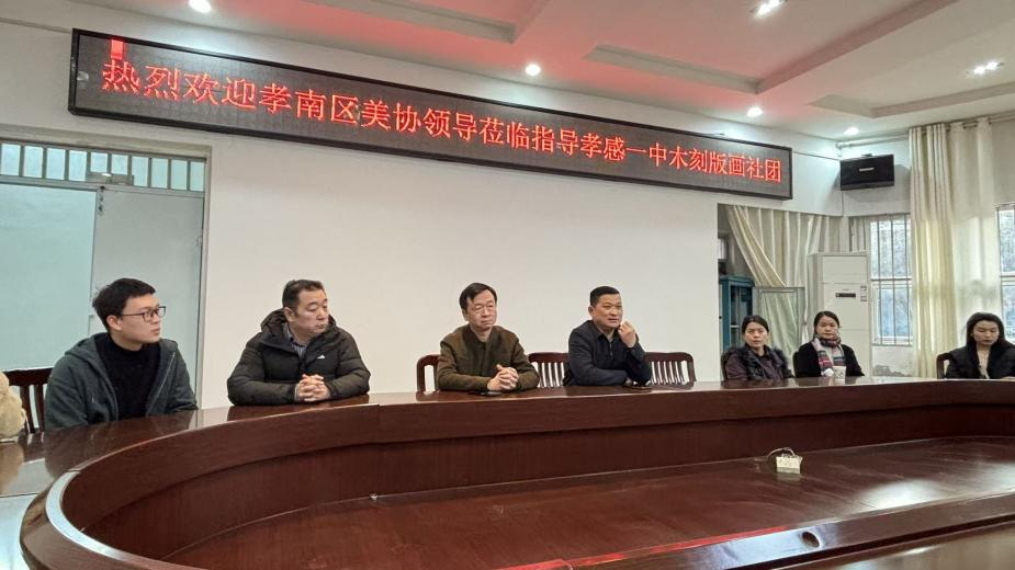 2026年3月12日,孝南区文联副主席、孝南区美术家协会主席周东,中国美术家协会会员、孝感市美术家协会副主席周梅元,中国美术家协会会员、湖北省国画院特聘画家张秀华,孝南区美协副主席贺江萍,孝南区美协理事、西湖中学副校长栾亚兰,孝南区美协理事、西湖中学美术教师张远斌,以及文昌中学美术教师吴恕娟、韩隶、彭翰枫、叶伶俐等一行,莅临孝感一中参观指导木刻版画社团建设工作。孝感一中校长夏以祥、副校长李绪凡、校办主任程国明、学生发展中心主任涂东方及美术教师王慧洋、程威等陪同参与。